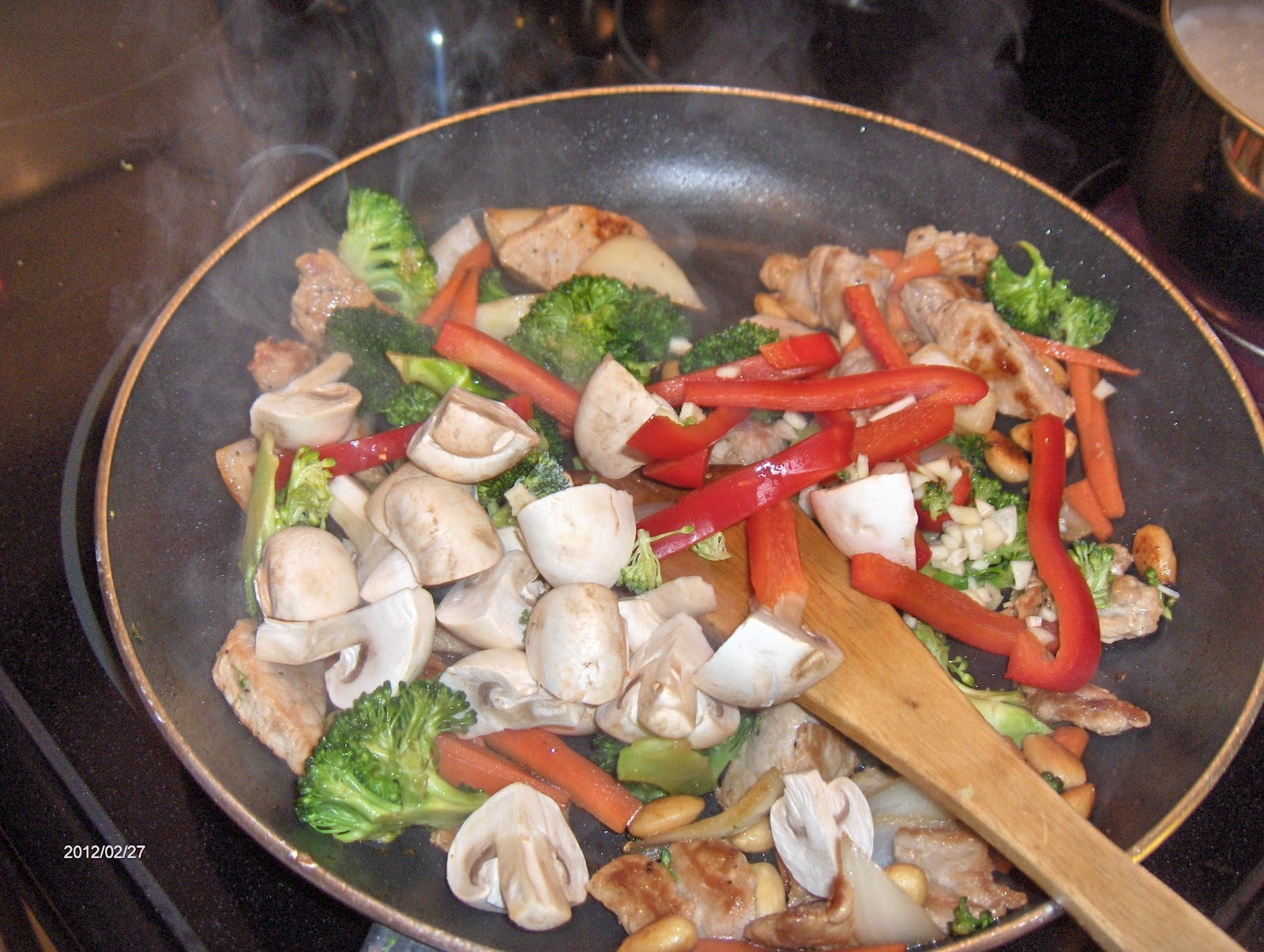 I serve stir fries with rice or noodles. If you are using rice, I would start it when you start chopping veg. If you are using noodles, I would start to boil water at the same time you start cooking. When the water comes to a boil, cook noodles for a few minutes and drain. I pour 1 Tbsp of oil into a hot pan. I then add a small handful of blanched almonds and start toasting them. After tossing them for a few minutes, I add the meat and brown it. Then I added the carrots, chunks of onion and broccoli. If the pan starts to dry out, add a little water.